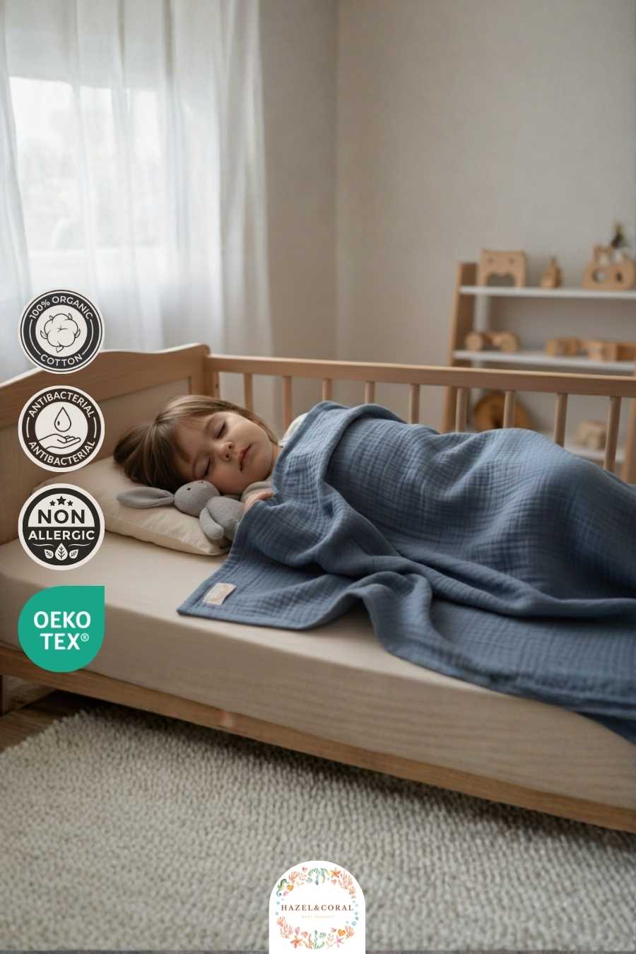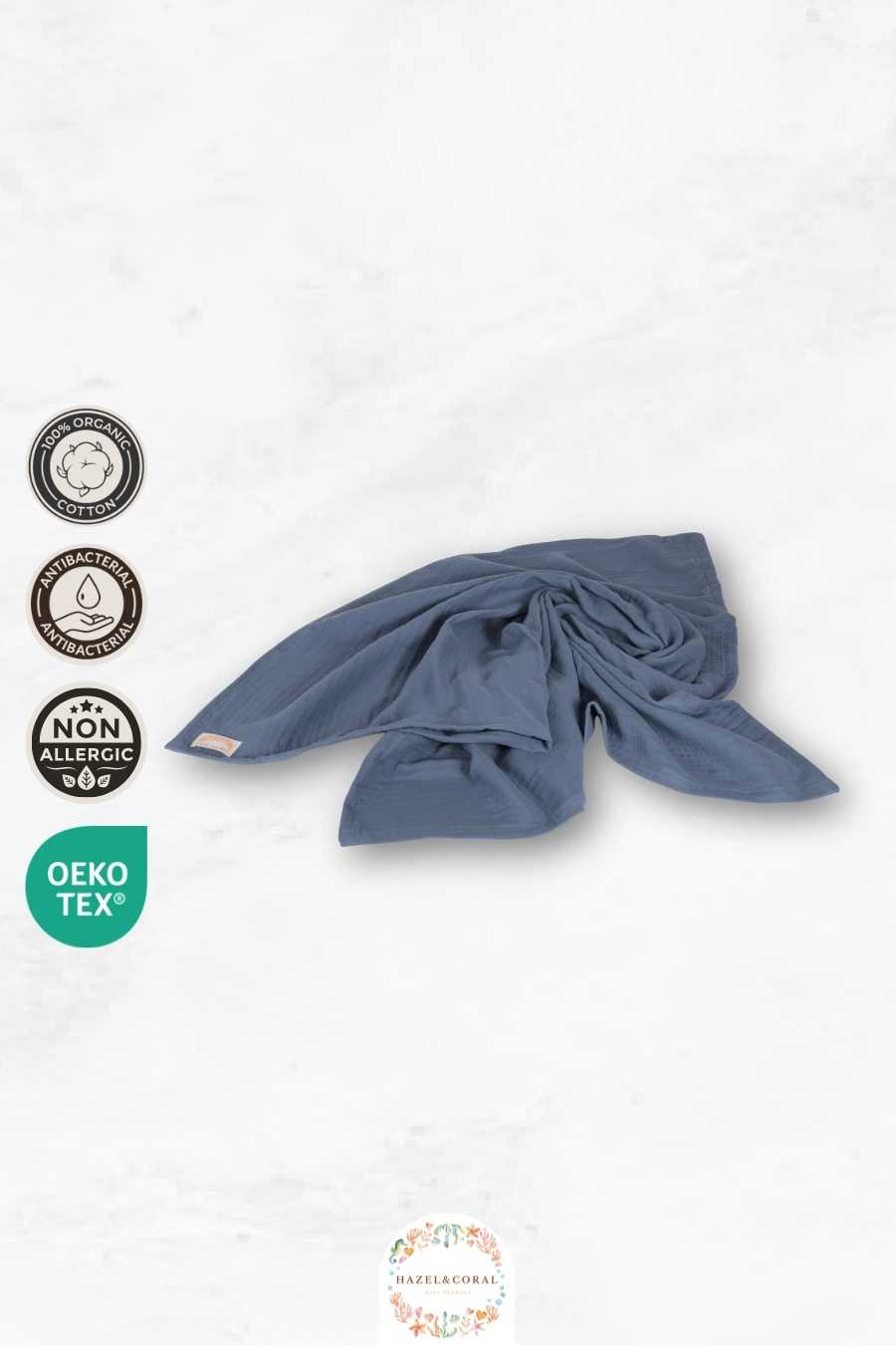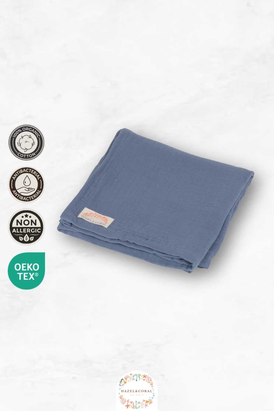 4 Katlı Müslin Battaniyesi Indigo Mavisi, bebeğiniz için ekstra yumuşaklık ve dengeli sıcaklık sunan, dayanıklı ve çok amaçlı bir kullanım sağlayan özel tasarımlı battaniyedir. Dört katlı müslin dokuması sayesinde daha dolgun bir yapı sunar, serin havalarda ideal koruma sağlar ve gün boyu konforlu bir deneyim oluşturur.