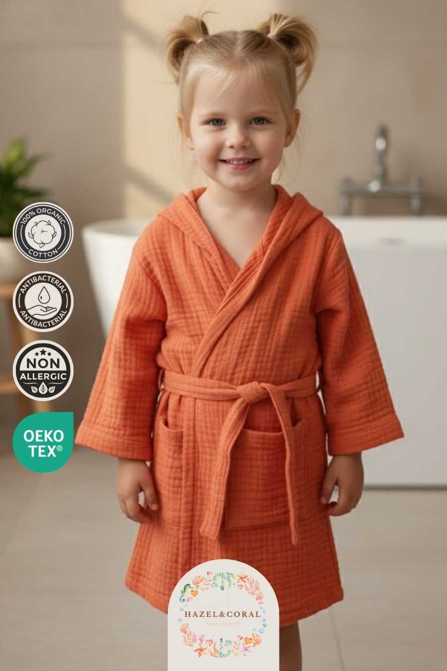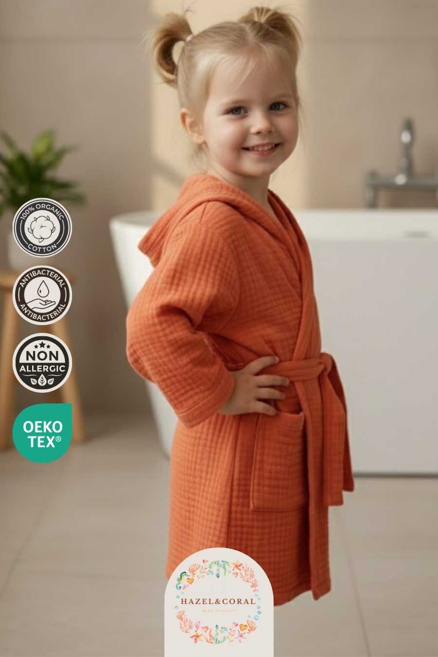Çocuk & Bebek Bornozu Kapüşonlu Kiremit Rengi, banyo sonrası hızlı kuruluk ve konfor sağlamak için tasarlanmış fonksiyonel bir üründür. Yüksek emiciliğe sahip yumuşak kumaşı sayesinde suyu kısa sürede emer, ciltte ıslaklık hissini azaltır ve bebeğinizin üşümesini önlemeye yardımcı olur.